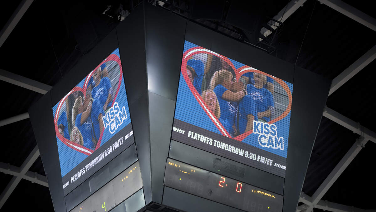 In the fourth quarter, it was Kiss Cam time and the screen featured a man sitting between two women. The loudest applause of the evening was when the man got the two women to kiss him, and then he got them to kiss each other.